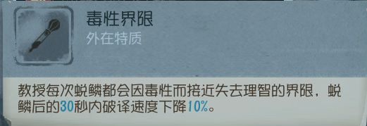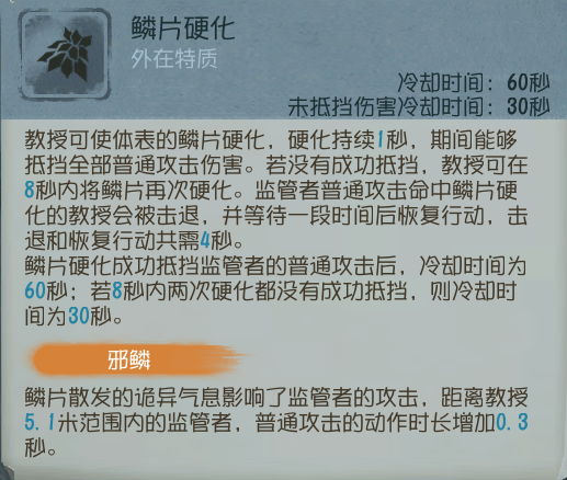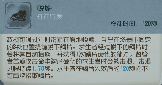 当使用鳞片硬化抵挡到一次伤害后会击退监管者,击退和恢复行动共需要4秒,这个时间已经足够转点了。教授的硬化只能持续1秒钟,要在监管者普通攻击时使用技能保护自己,容错率相对比较低,并且教授没有像病患和杂技那样可以拉开距离的道具,只能在板窗进行牵制不能依靠拉点牵制,因此对自身的牵制基本功与操作有一定要求。