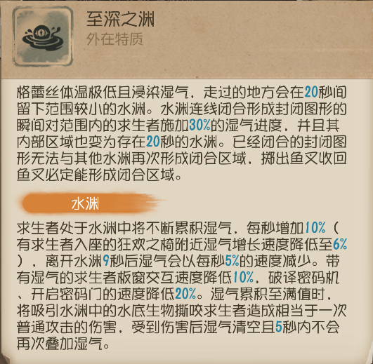 ③ 野人的伙伴不能抵挡湿气所造成的伤害,但守墓人的【遁地潜行】状态、先知的【役鸟】守护、园丁的护盾都可以抵挡湿气所造成的伤害。调香师使用【忘忧之香】进行回退后的湿气值等于第一次使用【忘忧之香】那一时刻的湿气值,因此在大多数情况下,调香师身处【水渊】之中不建议使用【忘忧之香】。在使用【忘忧之香】的过程中如果受到湿气的伤害,不建议进行回溯。