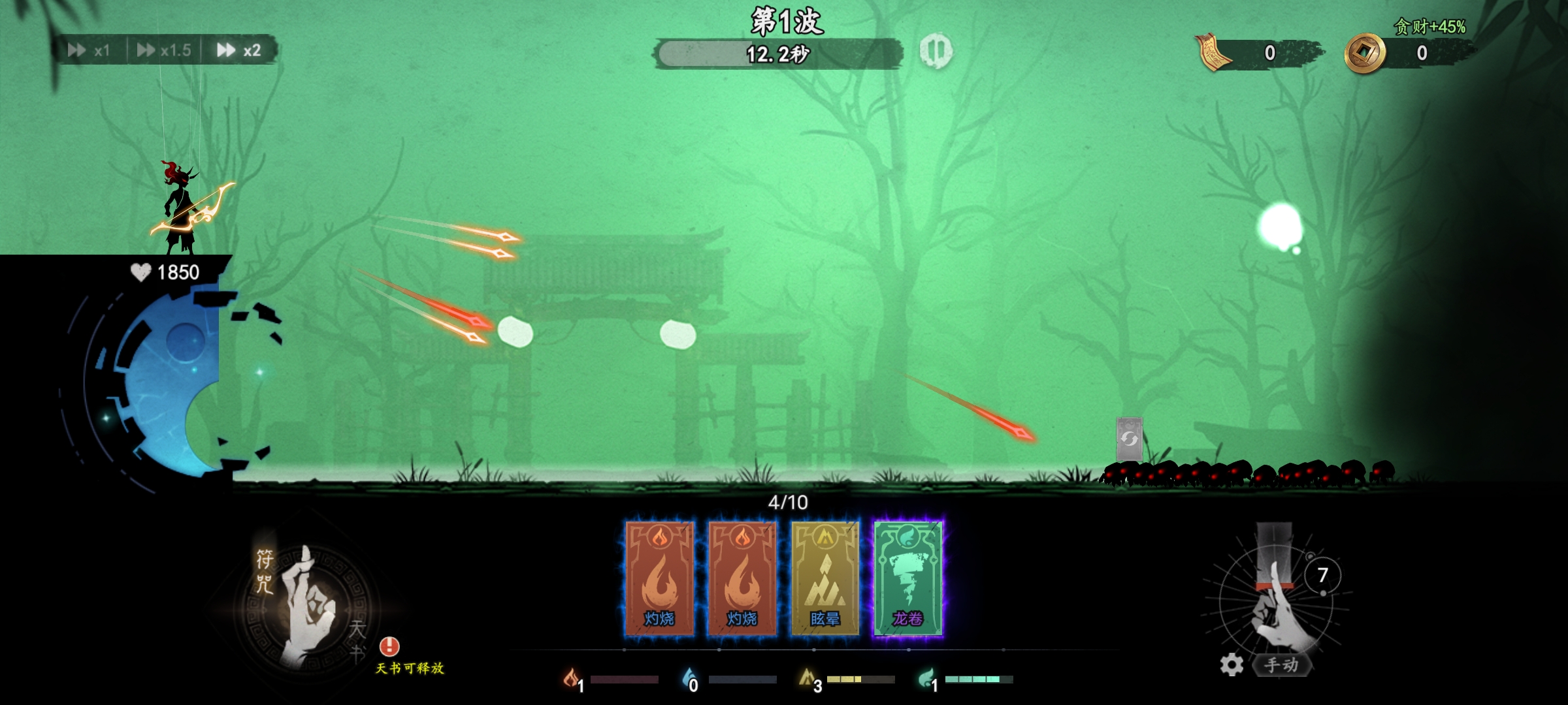 研究敌人: 每波开始前看看敌人类型和属性(血厚?移速快?飞行?抗击退?主页志怪录查看)。提前规划符咒,天书的使用/升级方向。
