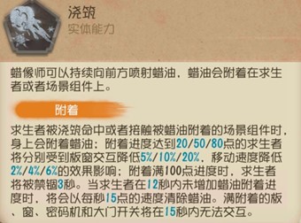蜡像师在追击中需要用【浇筑】对求生者施加减速及禁锢效果,同时要灵活运用【浇筑】对交互点进行封禁,因此【浇筑】技能的熟练度一定要高。在特殊地形利用【浇筑】提前封禁求生者一定会进行交互的木板或窗户,当求生者翻越未被封禁但附着蜡油的板窗时也会被附着蜡油,可以利用这个特性逼迫求生者翻越附着蜡油的板窗,让求生者“主动”附着蜡油。