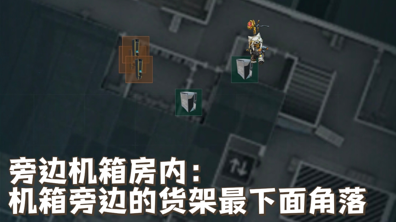 拉闸房旁边的机箱小房间3号点位可以说是“最阴暗的一集”:当我们进门之后因为视野缘故并不能第一时间能看清机箱右侧的货架,走到机箱跟前才会看到完整的货架,而夺舍的红狼就藏在这个货架的最下面的角落中。