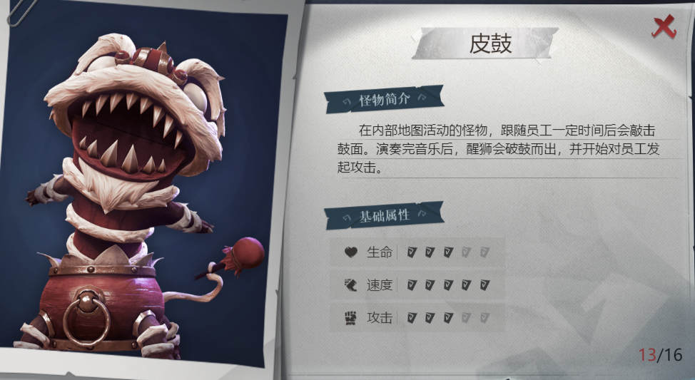 速度中等,会寻找并围绕在玩家身旁进行敲鼓,敲鼓速度会越来越快,直到变成二阶段(只有变为二阶段才会发动攻击)