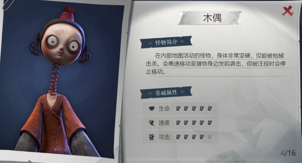 会主动追击玩家,速度较快,木偶停止移动时会出现弹簧声。