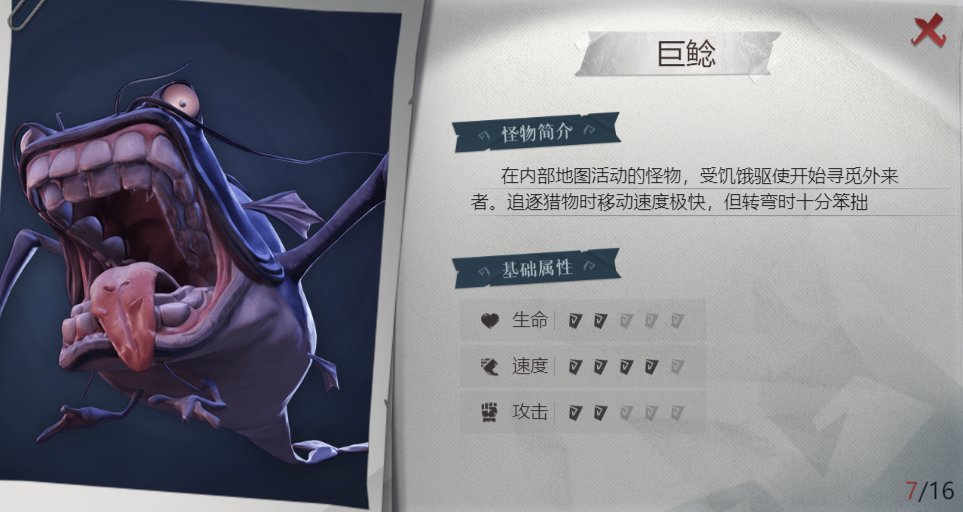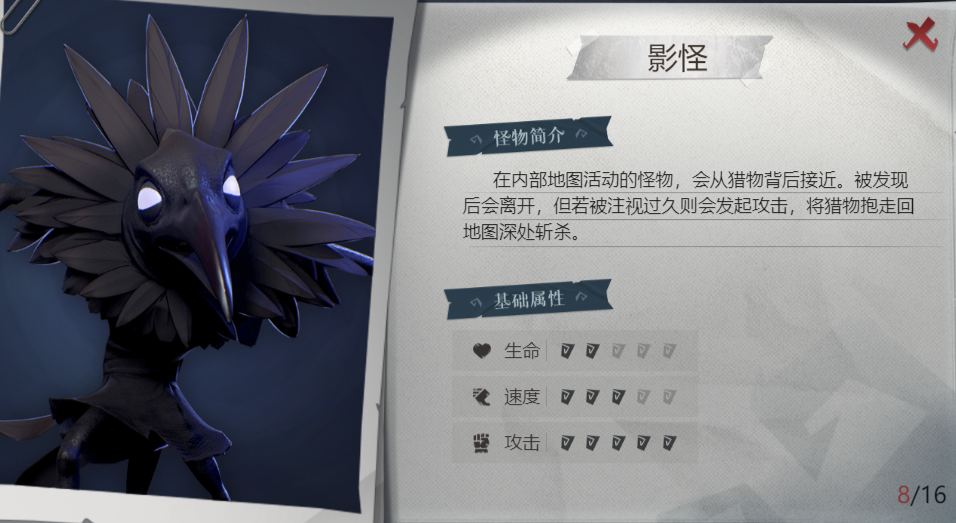 速度快,没有光源时会靠近玩家将玩家抱走,可挣脱,被手电筒🔦照到向其靠近会向后退。