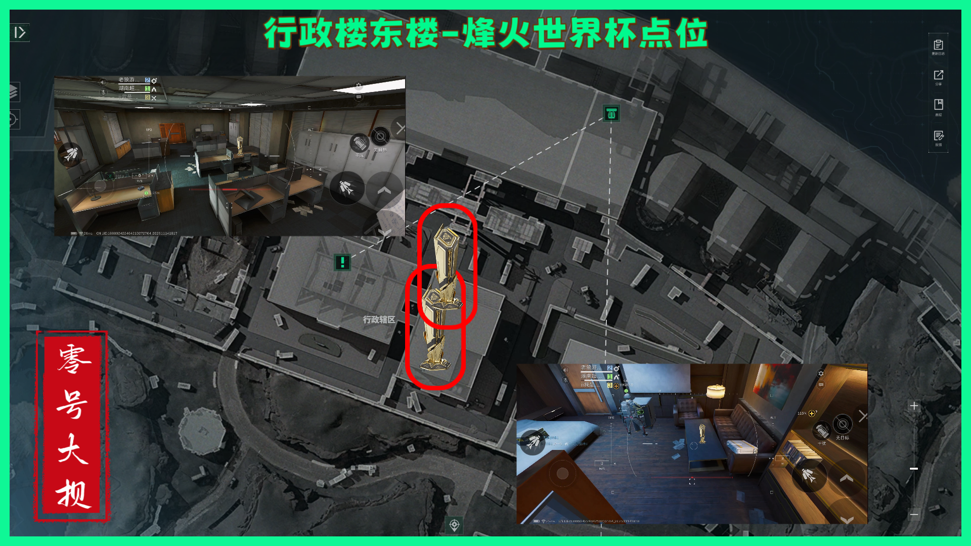 行政楼东楼一共有2个点位,图片从左到右位置依次在:东楼经理室对面的办公桌,桌子上都可能刷新和东楼经理室大保险箱刷新点旁边的茶几上,具体位置参考图片即可~