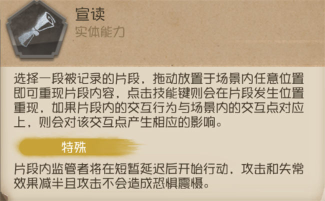 ①当宣读记录时,监管者的宣读行为会在约1秒延迟后释放,释放时要提前预判求生者走位及交互意图。