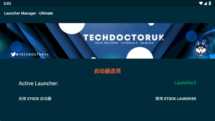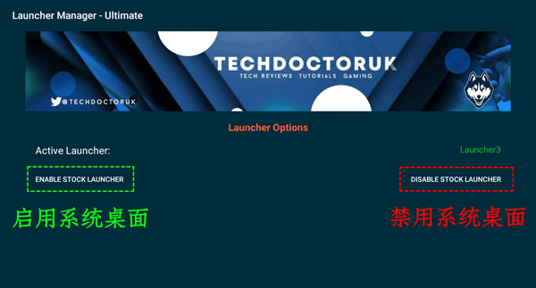 1、在电视或机顶盒上成功安装LMUltimate之后,打开并点击左下角的“ENABLE STOCK LAUNCHER”按钮(本站提供的版本已汉化处理)