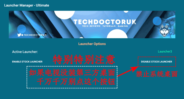 4、特别特别要注意的是用户智能电视机中没有装第三方桌面,不要去点击LM Ultimate软件中禁止系统桌面,否则不能进入到电视桌面中使用电视。也就是说在设置桌面时,你必须在电视或机顶盒上安装了第三方桌面app时才能关闭系统桌面