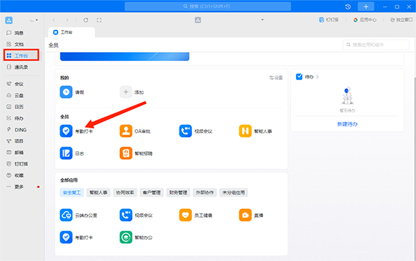 2、进入工作台界面,选择【考勤打卡】选项,