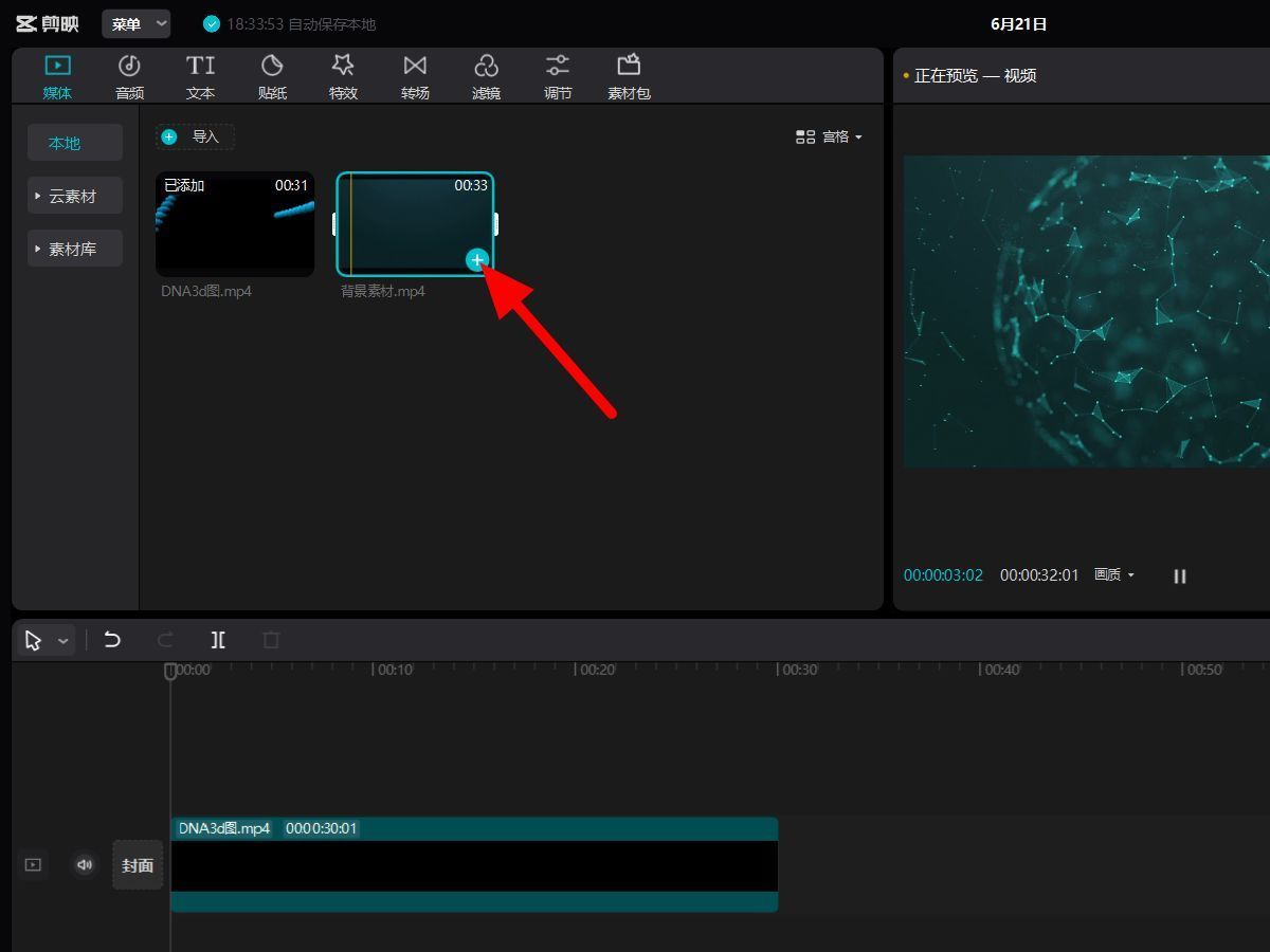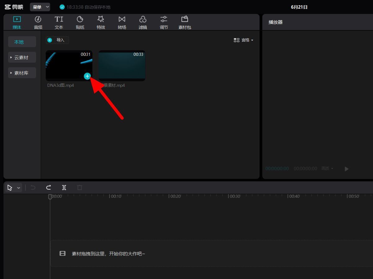 2、双击素材添加,将素材拖动到下方的剪辑栏。