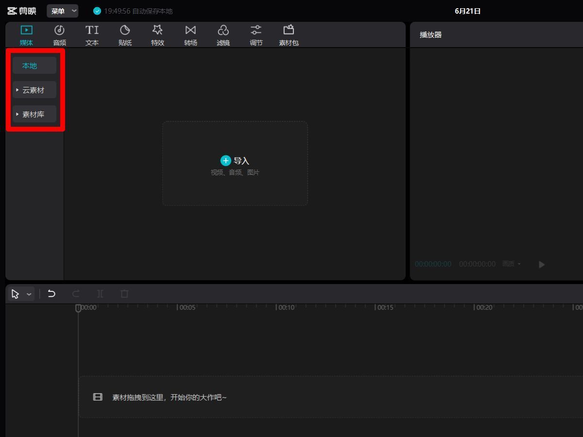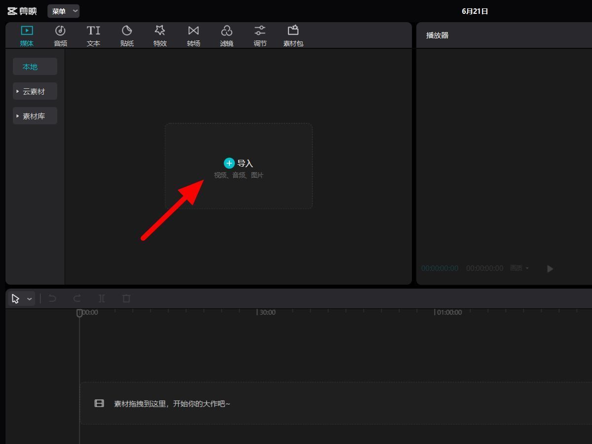 2、在剪映界面,可以通过本地、云素材、素材库来导入素材,以本地为为例,点击导入选项。