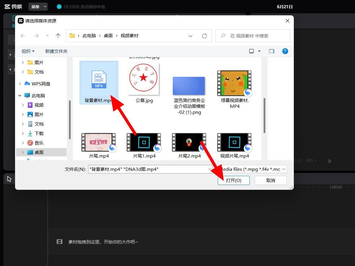 3、在请选择媒体资源界面,选择两段或两段以上的视频,点击打开选项。
