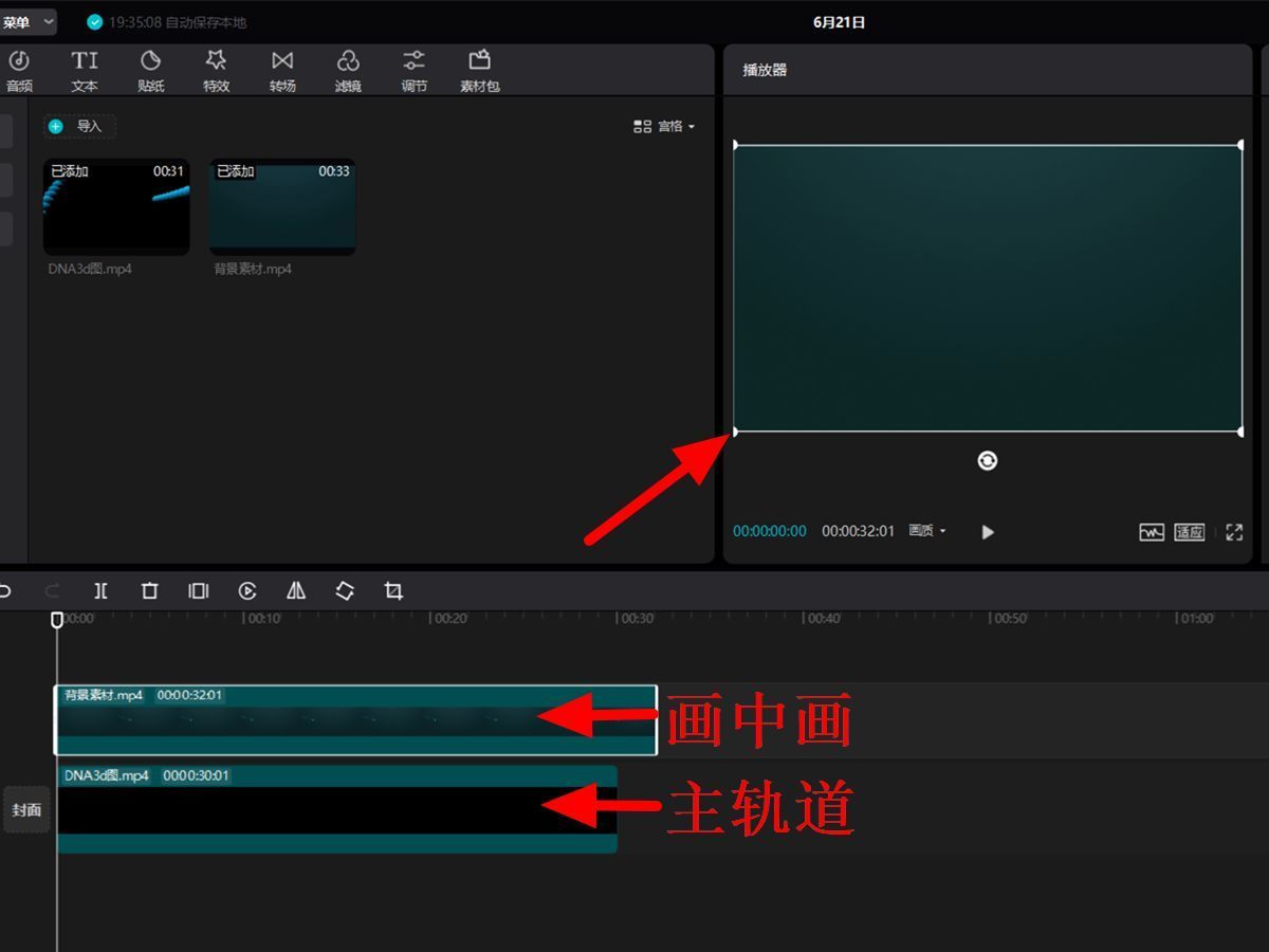 6、这样就进入画中画成功,含有封面的是主轨道视频,上面的视频就是画中画视频,选中画中画视频段,通过视频四周的圆点来调节画中画视频的大小和位置,这样就设置画中画成功。