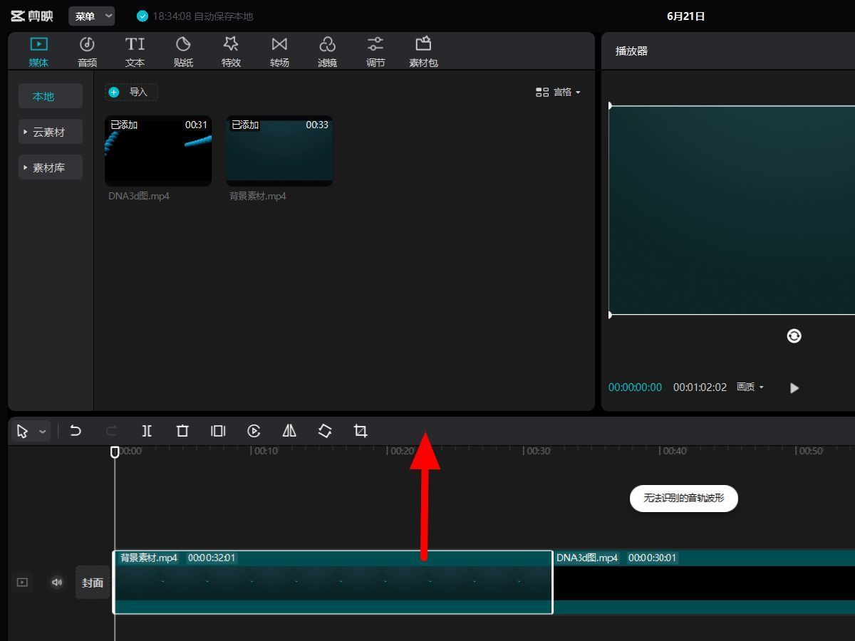 5、完成添加,选中要设置为画中画的视频段,向上或向下拖动视频段。