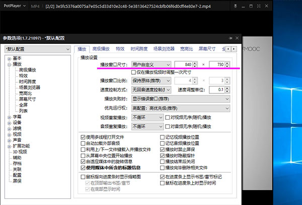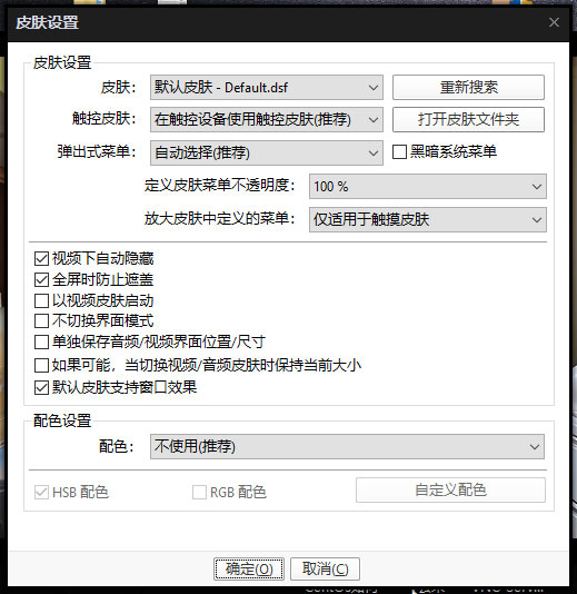 6.皮肤设置,勾选视频下自动隐藏,播放设置为:无边框尺寸;