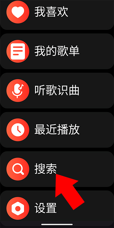 5、打开网易云音乐手表版并点击右上角的三条杠符号进入菜单界面后,往下滑找到搜索按钮
